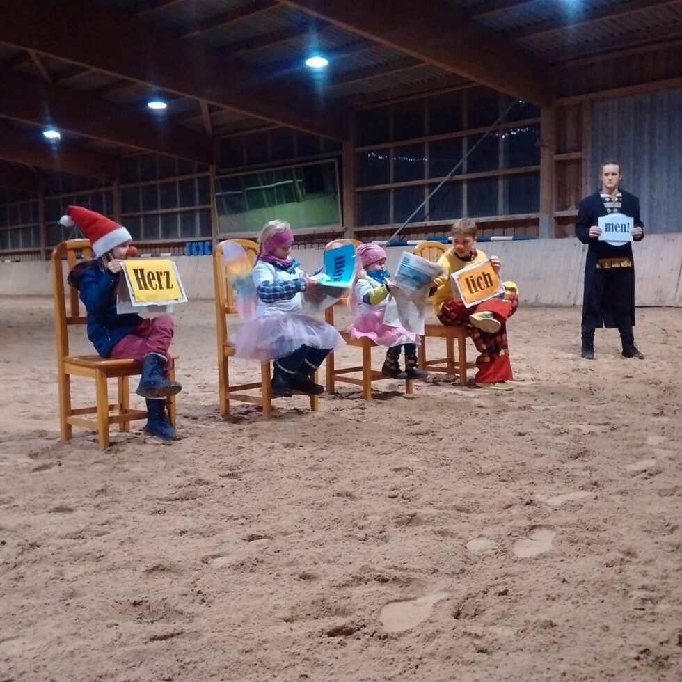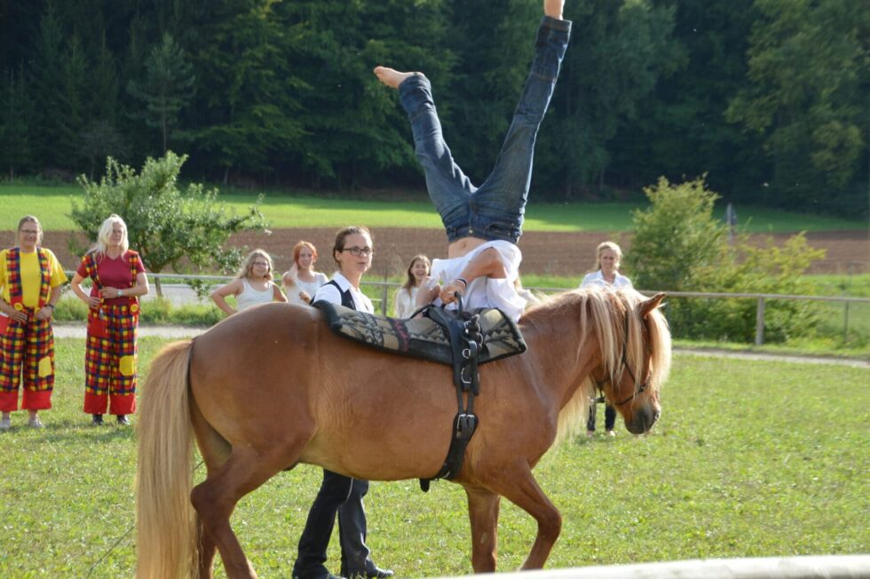 Viel Energie und Aufregung erfüllt uns, da jetzt immer mehr junge Menschen zu uns stoßen, und die Jungen am Hof zu wundervollen, verantwortungsvollen Mitstreitern heranwachsen. Unser „Vermächtnis an die Jugend“ wird auf diese Weise mit Leben gefüllt – junge Energie, neue Gedanken und Visionen. Äußerlich sieht man das beispielsweise daran, dass im Obstgarten Zirkus- und Bauwagen stehen, die von jungen Männern bewohnt sind. Aus dieser Verjüngung heraus haben wir einem alten Traum Leben eingehaucht. Beim Sommerseminar im August entstand unser Zirkus Samainetti. Zwei Vorstellungen hat der Zirkus bereits gegeben, die uns erfreut und beeindruckt haben. Kennen Sie die alten Immenhoffilme? Die Originalkutsche gehört jetzt Anna Mühlbauer, die am Samainhof lebt. Und sie fuhr mit ihrem Schmuckstück als Kutsche des Zirkus Samainetti in die Ovalbahn ein, gefolgt von einem bunten Reigen an Artisten und Clowns. Die alten Clowns haben daran erinnert, dass hinter dem lachenden Clownsgesicht Traurigkeit wohnt. Die Luft angehalten haben die Zuschauer, als die jungen Männer sich zu spektakulären Stunts auf die Pferde geschwungen haben. Die Mädchen waren hübsch anzuschauen, als sie auf den Pferden voltigiert haben. Raziel ist unsere wunderschöne Zirkusprinzessin, die mit ihrer Stute Atorka alle bezaubert. Manch Träne ist geflossen, wenn sich ihr Pferd zu ihr gelegt hat. Wir sind froh, dass unser neuer Zirkus in der Rundhalle der Samain-Siftung ein Zuhause hat. Und wir sind gespannt, wie es weitergehen wird mit dem Schwung des Jugendprojektes mit Unterstützung der liebevollen Reitlehrer und der alten Clowns
